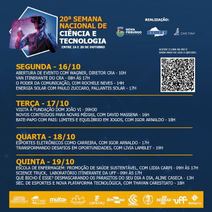 Ao longo do dia 19, a programação mostrou tudo de mais inovador, científico e tecnológico do município para cidadãos e alunos das unidades escolares do município. O evento também contou com diversos expositores parceiros, como por exemplo, a Secretaria Municipal de Agricultura, com apresentação da tecnologia envolvida na produção de morangos e tecnologia agropecuária com melhoramento genético; Universidade Federal Fluminense e Secretaria Municipal de Educação, por meio de experimentos científicos didáticos do projeto Science Truck; Ecosol, com exposição dos trabalhos manuais, utilizando materiais recicláveis; Escola de Auxiliares e Técnicos de Enfermagem Nossa Senhora de Fátima, com trabalhos sobre cuidados com o corpo, aferição de pressão arterial e orientações de educação em saúde para a comunidade; Cidade Inteligente, com apresentação do programa de monitoramento inteligente, feito por mais de 200 câmeras integradas que colaboram para a segurança do município; Muito Mais Educação Profissional, com projetos de robótica dos alunos; Estácio de Sá, com exposição de maquetes idealizadas por alunos do curso de Arquitetura e Urbanismo; Agência de Inovação da UFF, com apresentação e amostra da agência e startups; Firjan e 1ª equipe de First Robotic Competion, com o projeto de robótica; Colégio Nossa Senhora das Dores, com trabalhos selecionados da Feira Intercolegial de Ciência e Tecnologia; CEFET, com pesquisa sobre realidade virtual e turismo.