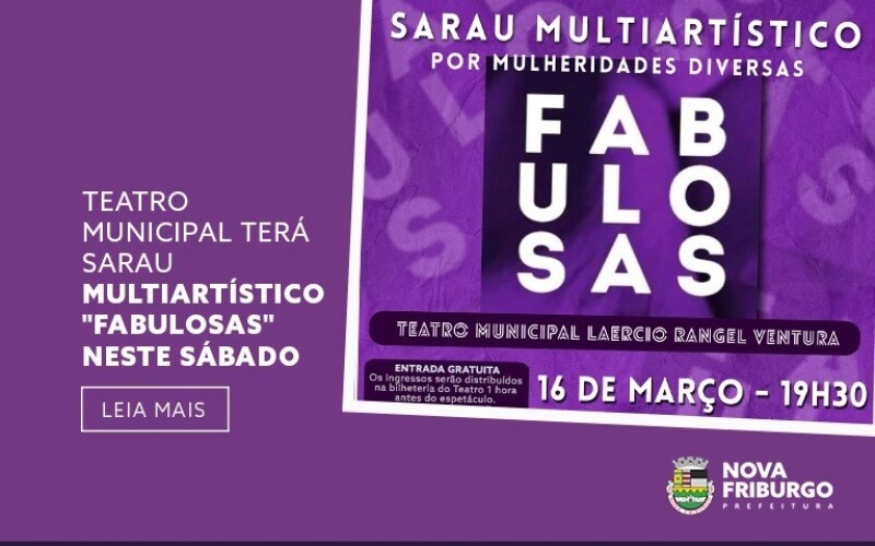 No sábado, dia 16, às 19h30, o Teatro Municipal Laercio Rangel Ventura recebe o sarau multiartístico Fabulosas - por mulheridades diversas. A apre ...