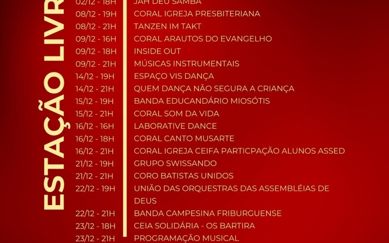 PROGRAMAÇÃO CULTURAL DO NATAL TERÁ SHOWS GRATUITOS NA ESTAÇÃO LIVRE A programação cultural de “Um Encanto de Natal – Fábrica de Sonhos” ...