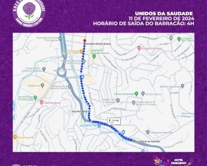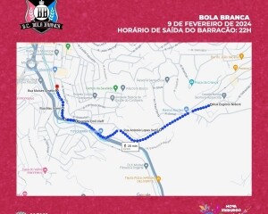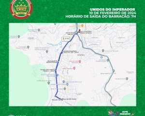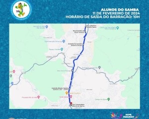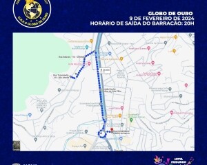 Trajeto: Rua Albertino Quadro Gama (o deslocamento seguirá pelo contrafluxo da via. Haverá interrupção do fluxo de veículos e proibição de estacionamento às 18h do dia 9 de fevereiro de 2024) / Rua Clarindo da Rosa Teixeira (o deslocamento seguirá pelo contrafluxo da via. Haverá proibição de estacionamento e interrupção do fluxo de veículos. O fluxo de veículos com destino ao bairro de Conselheiro Paulino e adjacências será desviado para a Avenida Governador Roberto Silveira) / Avenida Governador Roberto Silveira {sentido Centro} / Avenida Presidente Costa e Silva (o fluxo de veículos com destino ao Centro poderá ser desviado para a Rua Benjamin Constant durante o deslocamento. Ao longo da via, haverá interrupções temporárias nos cruzamentos de acesso à avenida) / Avenida Alberto Santos Dumont / Avenida Doutor Galdino do Vale Filho (haverá interrupção temporária nas vias de acesso à avenida) / Praça Marcílio Dias (o deslocamento seguirá no contrafluxo. Haverá interrupção temporária para a travessia até o ponto de posicionamento) / Rua Comandante Ribeiro de Barros (a via terá proibição de estacionamento no trecho compreendido entre a altura do nº 3 e o nº 17 até o término do evento).