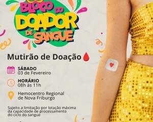 O Hemocentro Regional de Nova Friburgo realizará no próximo sábado, dia 03/02, um mutirão de doação de sangue, das 8h às 11h. A ação busca atender às pessoas que não conseguem ir ao Hemocentro durante a semana para doar. Além disso, neste período carnavalesco, a demanda por sangue aumenta, e sua contribuição pode fazer toda a diferença! Ao doar, você não apenas reforça nossos estoques, mas também proporciona esperança e vitalidade para aqueles que mais precisam.