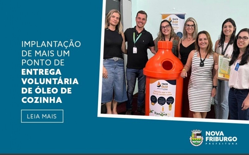 Nesta quarta-feira, 20 de dezembro, foi implantado mais um Ponto de Entrega Voluntária, do programa Trata Óleo, dessa vez, na sede da Secretaria Municipal de Educação. A ação segue realizando a divulgação da ação de coleta do óleo vegetal, promovida pela Concessionária Águas de Nova Friburgo, em parceria com as Secretarias Municipais de Meio Ambiente e Desenvolvimento Urbano Sustentável e de Educação. A secretária de Educação, Caroline Klein, a subsecretária de Gestão em Ensino e Aprendizagem, Cíntia Damazio e a equipe técnica da Secretaria de Meio Ambiente, estiveram presentes.