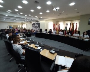 Durante a programação do encerramento do Câmara Jovem, as escolas que participaram, receberam livros com os Projetos de Lei, apresentados e aprovados em sessão ordinária pelos Jovens Vereadores.