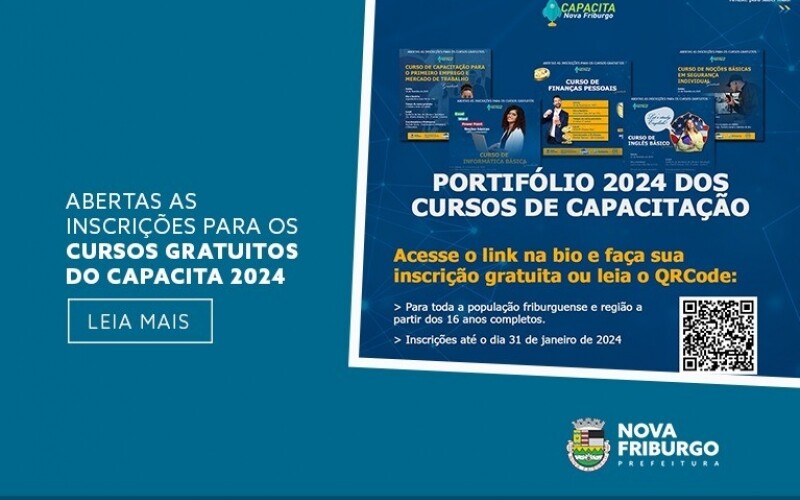 Quem busca qualificação, com cursos gratuitos, não pode perder a oportunidade de se inscrever para participar do Capacita no ano de 2024. Os cursos disponíveis são: Finanças Pessoais; Inglês Básico; Informática Básica; Noções Básicas em Segurança Individual; Capacitação para o Primeiro Emprego e Mercado de Trabalho. As inscrições são abertas para toda população friburguense e da região, a partir dos 16 anos completos.