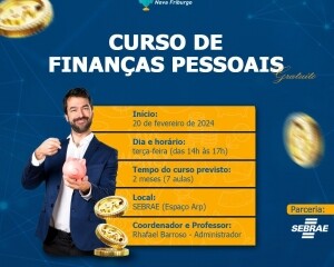 Finanças Pessoais – 20/02/2024 (terça-feira, 14h às 17h), no Sebrae – Espaço Arp. O curso terá duração de 2 meses (7 aulas), com Rhafael Barroso, professor e administrador.
