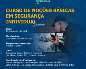 Noções Básicas em Segurança Individual – 21/02/2024 (quarta-feira, 18h às 21h), no Auditório da Secretaria de Ciência e Tecnologia. O curso terá duração de 2 meses (7 aulas), com Vinícius Domingues, certificado pela ASIS e fundador da ABSEG, e Valter de Souza, especialista em segurança, fuzileiro naval e instrutor de tiro.