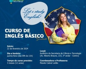 Inglês Básico – 22/02/2024 (quinta-feira, 9h às 11h), no Auditório da Secretaria de Ciência e Tecnologia. O curso terá duração de três meses (12 aulas), com a professora Maraliz Cabral Leitão.