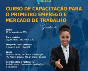 Capacitação para o primeiro emprego e mercado de trabalho - 19/02/2024 (segunda-feira, 14h às 17h), no Auditório da Secretaria de Ciência e Tecnologia. O curso terá duração de 2 meses e meio (10 aulas), com Rochele Neves, coordenadora pedagógica e educadora.