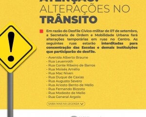 Em razão do Desfile Cívico-militar de 07 de setembro, a Secretaria de Ordem e Mobilidade Urbana fará alterações temporárias em ruas no Centro. No período entre as 22h da quarta-feira, dia 06, até as 14h da quinta-feira, dia 07 de setembro, as seguintes ruas estarão interditadas para concentração das Escolas e demais Instituições que participarão do desfile: