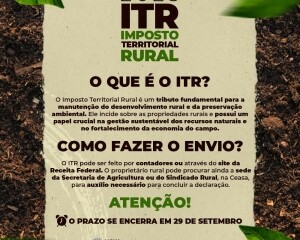 A Secretaria Municipal de Agricultura e Desenvolvimento Rural da Prefeitura de Nova Friburgo lembra aos donos de imóveis rurais que o prazo para envio da declaração do Imposto Territorial Rural (ITR) 2023 se encerra no dia 29 de setembro. É importante que o proprietário rural cumpra suas obrigações tributárias, respeitando o prazo estabelecido para evitar complicações e penalidades.