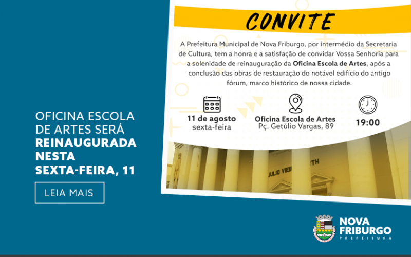 Um dos projetos culturais mais importantes de Nova Friburgo está com a casa nova. Após a conclusão das obras de restauração, a Prefeitura de Nova Friburgo, por meio da Secretaria Municipal de Cultura, reinaugura a Oficina Escola de Artes na próxima sexta-feira, 11 de agosto, às 19h.