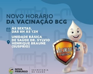 A partir de julho o horário da vacinação da BCG, que protege contra formas graves da tuberculose, será modificado em Nova Friburgo. Já na próxima semana a aplicação acontecerá às sextas-feiras, das 8h às 12h, na Unidade Básica de Saúde Dr. Sylvio Henrique Braune, no Suspiro.