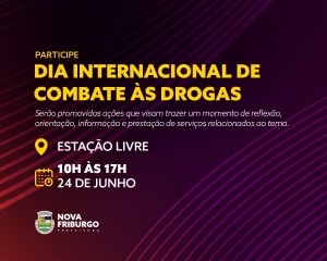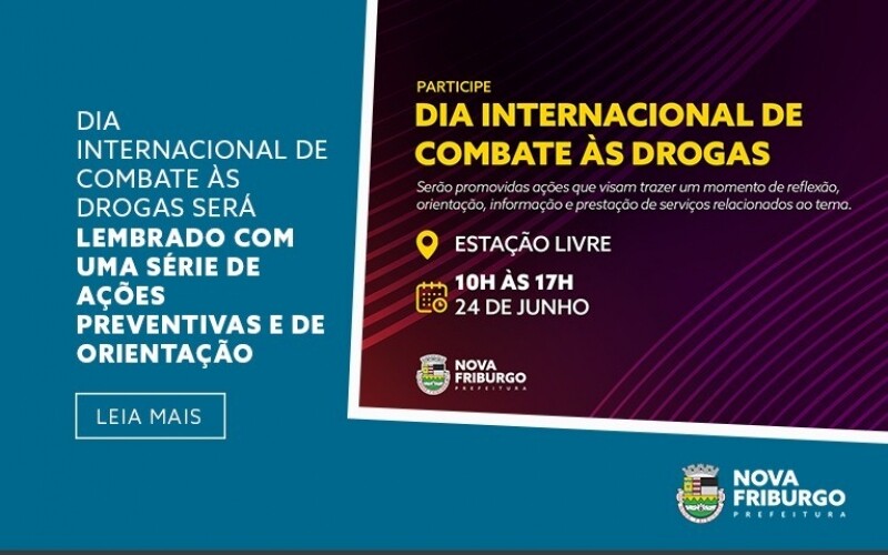 O Dia Internacional de Combate às Drogas é celebrado anualmente no dia 26 de junho. Em alusão à data, a Prefeitura de Nova Friburgo e o Conselho Municipal de Política Sobre Drogas de Nova Friburgo (Compod-NF), promovem no próximo sábado, 24 de junho, das 10h às 17h, na Estação Livre, no Centro, uma série de ações que visam trazer um momento de reflexão, orientação, informação e prestação de serviços relacionados ao tema.
