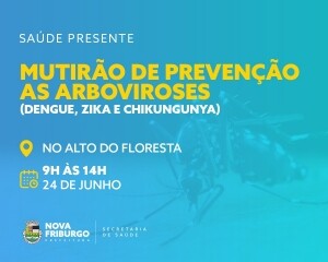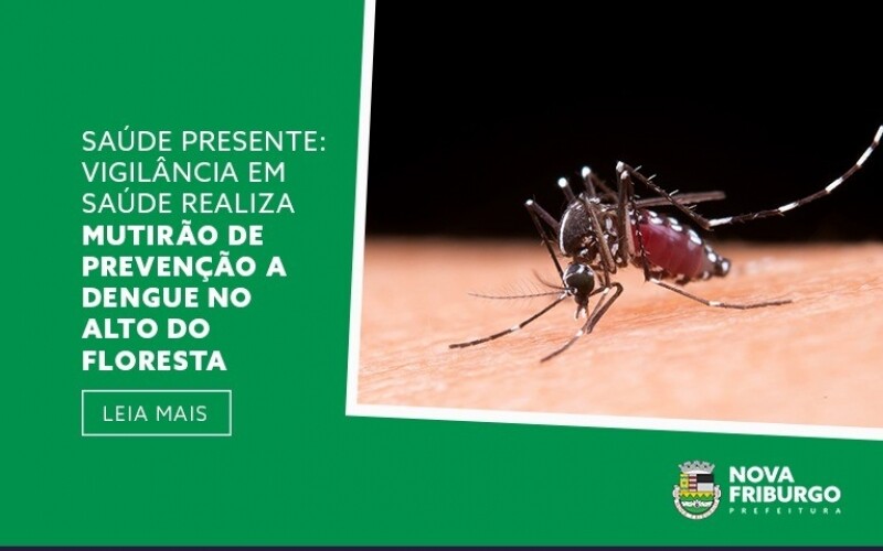 No próximo sábado, 24, a Secretaria Municipal de Saúde de Nova Friburgo, por meio da Subsecretaria de Vigilância em Saúde, realizará mais uma ação ‘’Saúde Presente’’, com mutirão de prevenção aos agravos provenientes das arboviroses, como a dengue, chikungunya e zika, no Alto do Floresta.