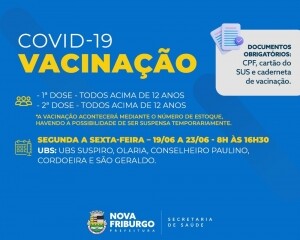Durante a próxima semana, entre os dias 19 e 23 de julho, a Prefeitura de Nova Friburgo continuará oferecendo a vacinação contra a covid-19 para a população. O objetivo da Secretaria Municipal de Saúde é elevar as taxas de imunização no município.