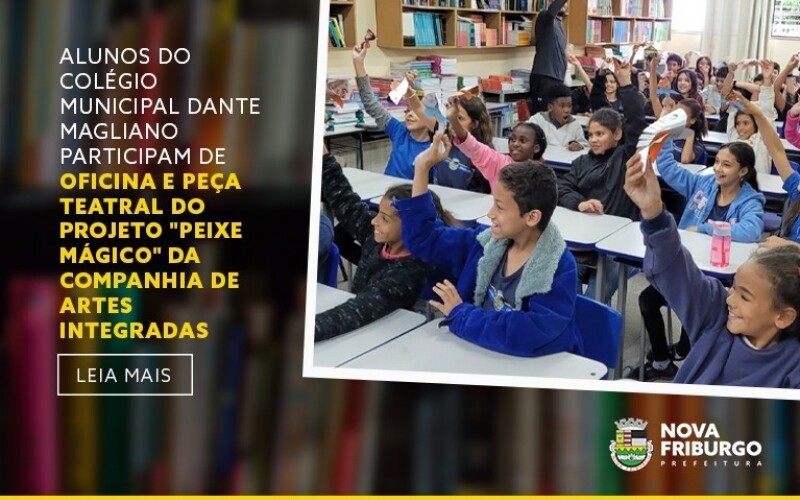 Nesta terça feira, 30 de maio, os alunos do Colégio Municipal Dante Magliano, no bairro Ponte da Saudade, participaram da oficina "Bonecos reciclados" e assistiram ao espetáculo teatral "O Peixe Mágico", idealizado pela Companhia Artes Integradas. A ação está sendo realizada pelo Ministério da Cultura, por meio da Lei de Incentivo à Cultura, em parceria com a concessionária Águas de Nova Friburgo e conta com o apoio da Secretaria Municipal de Educação.