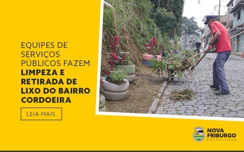 A Prefeitura, através da Secretaria de Serviços Públicos, iniciou mais uma semana realizando a limpeza nas ruas do bairro Cordoeira, com varrição e retirada de lixo. Este é o bairro de Nova Friburgo que produz maior quantidade de lixo diariamente, cujo descarte, em muitas das vezes, é feito em locais inapropriados, o que causa desordem e oferece grande risco à saúde dos moradores.
