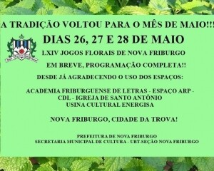 A tradição voltou para o mês de maio. Nos dias 26, 27 e 28 serão realizados os LXIV Jogos Florais de Nova Friburgo. As atividades ocuparão diversos espaços da cidade, como a Academia Friburguense de Letras, Espaço Arp, Câmara de Dirigentes Lojistas (CDL), Capela Santo Antônio e a Usina Cultural Energisa.