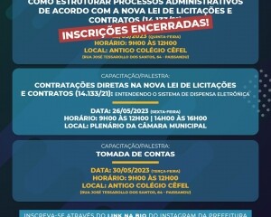 No dia 26, a capacitação será sobre “Contratações diretas na nova Lei de Licitações (14.133/21): Entendendo o Sistema de Dispensa Eletrônica”, com o palestrante Jonathan Chaves, no plenário da Câmara Municipal, das 9h às12h e das 14h às 16h. Inscrições ainda podem ser feitas no perfil da EFG @efgnovafriburgo, clicando AQUI ou pelo link https://forms.gle/tkdFnEDNomecH9Zk9.