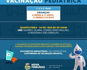 A campanha pediátrica, que oferece primeira, segunda e terceira doses, também continua durante a próxima semana. Na quarta-feira, 24, as vacinas para os pequenos com mais 6 meses de vida e menos de 12 anos estarão disponíveis nas salas de vacina das Unidades Básicas de Saúde.