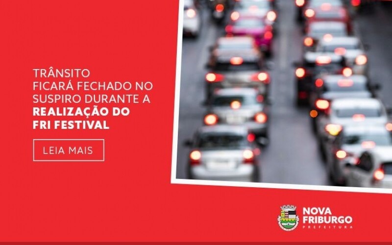 A partir desta sexta-feira, 12, a Prefeitura de Nova Friburgo, por meio da Secretaria Municipal de Ordem e Mobilidade Urbana (Smomu), vai fechar o trânsito no Suspiro, na altura da Rua Salusse, via que fica em frente a Capela Santo Antônio e o Teatro Municipal, até as proximidades do Hotel Dominguez Plaza. A interrupção se estenderá até a terça-feira, 16, durante a realização do Fri Festival Nova Friburgo 205 anos.