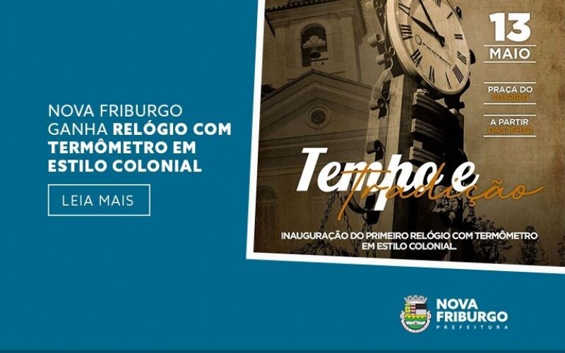 Nova Friburgo completa 205 anos no próximo dia 16, e um dos presentes para a população e turistas é o relógio com termômetro em estilo colonial adquirido pela Prefeitura Municipal de Nova Friburgo, por meio da Secretaria de Turismo. A inauguração do equipamento acontece no próximo sábado, dia 13 de maio, às 16h30, na Praça do Suspiro, no Centro.