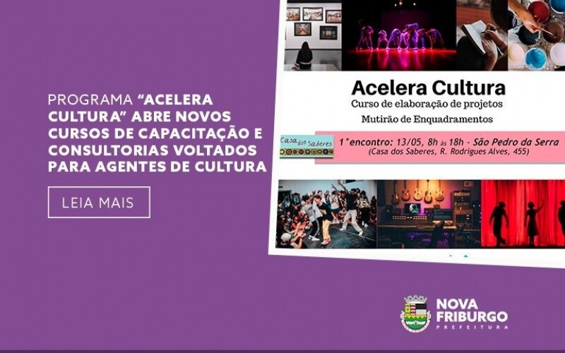 A Secretaria Municipal de Políticas Culturais de Nova Friburgo e o Instituto Serrano de Economia Criativa abrem inscrições para os cursos de capacitação e consultorias de elaboração de projetos e planos de negócios no programa “Acelera Cultura”. As atividades estão divididas em dois formatos: Imersão de Elaboração de Projetos (on-line e presencial); e Mutirão de Enquadramento de Projetos (presencial).