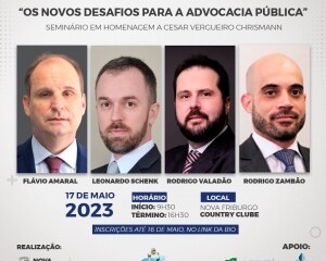 O seminário com o tema “Os novos desafios para a advocacia pública” será realizado no dia 17 de maio próximo, uma quarta-feira, das 9h30 às 16h, no teatro do Nova Friburgo Country Clube. O evento é promovido pela Prefeitura de Nova Friburgo, por meio da Procuradoria-Geral, e tem apoio do Nova Friburgo Country Clube e Associação Comercial Industrial e Agrícola de Nova Friburgo (Acianf). As inscrições on-line são gratuitas e podem ser feitas até 16 de maio, pelo site da Prefeitura de Nova Friburgo - www.novafriburgo.rj.gov.br ou CLIQUE AQUI. Os participantes receberão certificados emitidos pela Escola Friburguense de Gestão (EFG).