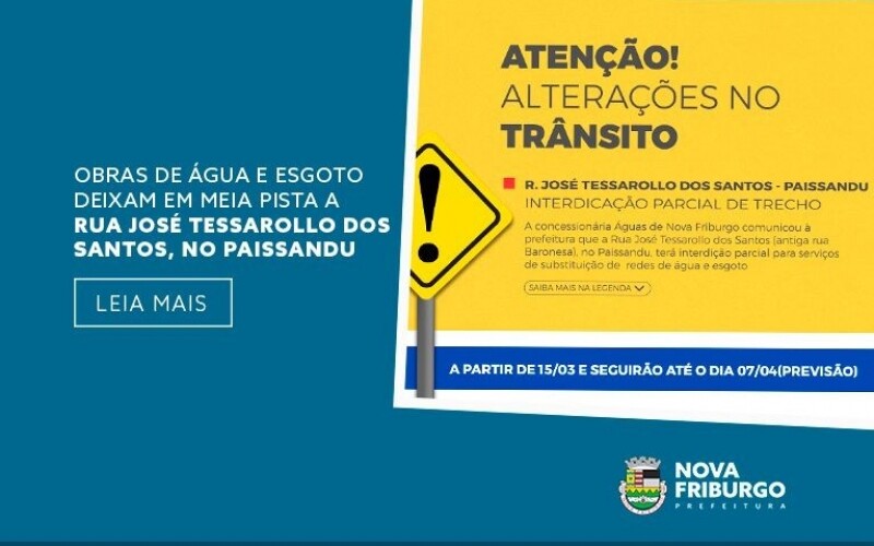 A concessionária Águas de Nova Friburgo comunicou à prefeitura que a Rua José Tessarollo dos Santos (antiga rua Baronesa), no Paissandu, terá interdição parcial a partir desta quarta-feira, dia 15, para serviços de substituição de redes de água e esgoto. A previsão de término dos trabalhos é no dia 7 de abril próximo.