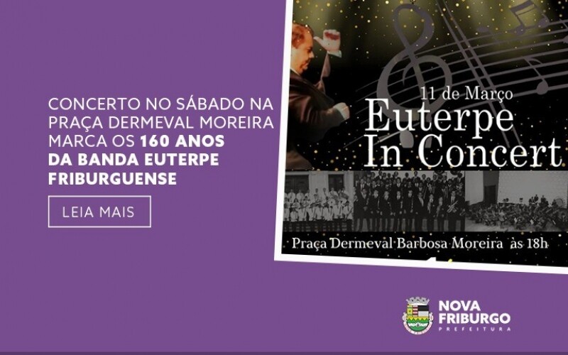 A Sociedade Musical Beneficente Euterpe Friburguense completou 160 anos no dia 26 de fevereiro passado. No entanto, devido a data próxima ao carnaval, as comemorações foram adiadas para este sábado, 11 de março. O aniversário da “Centenária das Centenárias” será comemorado com um concerto às 18h, na Praça Dermeval Barbosa Moreira, em parceria com a Prefeitura de Nova Friburgo, por meio da Secretaria Municipal de Cultura.
