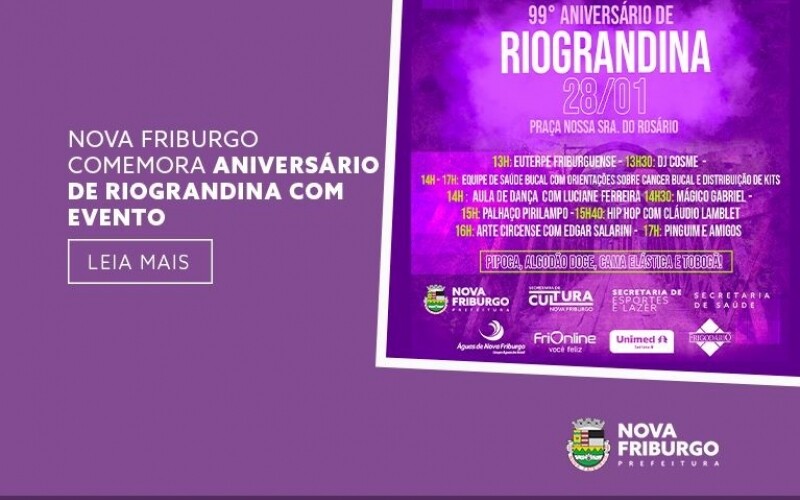 A Prefeitura Municipal de Nova Friburgo, juntamente com moradores e amigos de Riograndina, vai celebrar os 99 anos do distrito em evento no próximo sábado, 28/01, na Praça Nossa Senhora do Rosário, das 13h às 17h. A organização é das Secretarias Municipais de Cultura, Esportes e Lazer e Saúde.