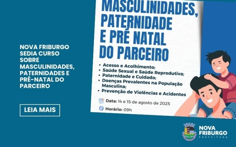 Nos dias 14 e 15 de agosto, Nova Friburgo será palco do curso "Masculinidades, Paternidades & Pré-Natal do Parceiro", promovido pela Coordenação de Atenção Integral à Saúde do Homem do Ministério da Saúde, em cooperação técnica com o Instituto PROMUNDO. A capacitação será realizada na Câmara Municipal de Vereadores, a partir das 9h, e reunirá profissionais da área da saúde de 16 municípios da Região Serrana.