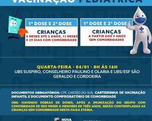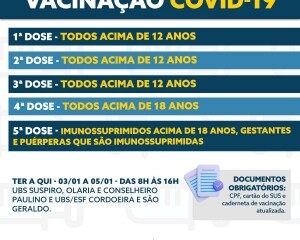 A campanha está disponível de terça a sexta-feira, visto que segunda-feira, 2 de janeiro, excepcionalmente, é ponto facultativo no Município. A partir das 8h até às 16h, nas Unidades Básicas de Saúde do Suspiro, Olaria, Conselheiro Paulino, Cordoeira e São Geraldo é possível encontrar o imunizante.