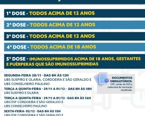 Já o público de 3 e 4 anos terá a vacinação retomada após a chegada de nova remessa de Coronavac. A aplicação de primeira e segunda dose acontecerá na terça e quarta-feira, dias 29 e 30. Para a população acima de 12 anos a cidade oferta primeira, segunda e terceira doses. O grupo com mais de 18 anos pode receber a quarta dose, enquanto a quinta dose já é ofertada para população imunossuprimida acima de 18 anos, gestantes e puérperas imunossuprimidas.