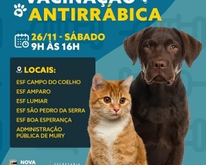 A antirrábica acontece das 9 às 16 horas na administração pública de Mury e nas Estratégias de Saúde da Família dos outros locais. A imunização é muito importante para combater a doença, que tem a letalidade em 99% aproximadamente. Até o momento, mais de 18.000 cães e gatos já foram vacinados no município.