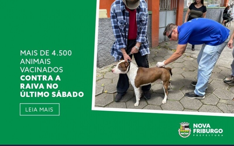 A Secretaria Municipal de Saúde, através da equipe da Subsecretaria de Vigilância em Saúde, vacinou 4.533 animais no último sábado, 5, em mais uma etapa da campanha de vacinação antirrábica realizada em Nova Friburgo. As equipes estiveram no Centro, Olaria, Lagoinha, Bela Vista, Cascatinha, Cônego e Vargem Grande.