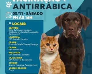 No próximo sábado, 05 de novembro, novos bairros da zona urbana serão contemplados. Das 9 às 16 horas, a vacinação acontece no Centro, na sede da Subsecretaria de Vigilância em Saúde (Rua Augusto Cardoso, 62); Lagoinha (Escola Municipal Anna B. Moreira); Olaria (UBS E ESF II, conhecida como Amarelinho); Bela Vista (Escola Municipal Patrícia J. Santana); Cascatinha (Escola Municipal Amâncio Azevedo); Cônego (Creche Municipal Augusta Horns); e Vargem Grande (na praça).
