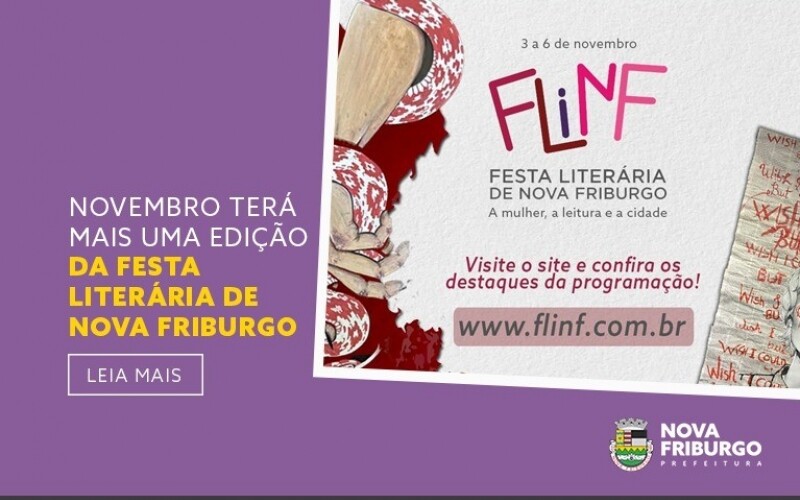 De 3 a 6 de novembro, acontecerá mais uma edição da FLINF - Festa Literária de Nova Friburgo. Com o apoio da Prefeitura, através da Secretaria de Cultura, o evento deste ano será voltado para o tema “A mulher, a literatura e a cidade”. A FLINF é uma realização da Genipapo Produtora e nasceu em 2016 com a participação de setenta voluntários.