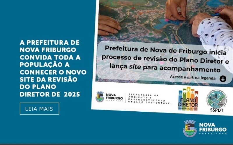 A Prefeitura de Nova Friburgo convida toda a população a conhecer o novo site da Revisão do Plano Diretor de 2025: https://planodiretornf2025.wixsite.com/revis.