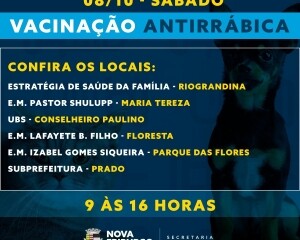A vacinação com antirrábica será realizada das 9 às 16 horas nos seguintes locais: Estratégia de Saúde da Família de Riograndina, E.M. Pastor Shulupp, em Maria Tereza, UBS de Conselheiro Paulino, E.M. Lafayete Bravo Filho, no Floresta, E.M. Izabel Gomes Siqueira, no Parque das Flores e na Subprefeitura do Prado. As outras localidades serão divulgadas na próxima semana.