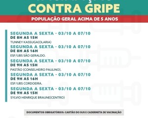 A partir dos cinco anos, crianças, adolescentes, jovens, adultos e idosos recebem a vacina na Unidade Básica de Saúde de Olaria, Suspiro, Conselheiro Paulino, Cordoeira e São Geraldo. Confira os horários na imagem em anexo.