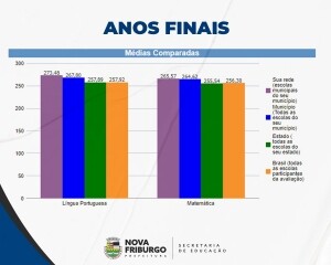 O Instituto Nacional de Estudos e Pesquisas Educacionais Anísio Teixeira (Inep) aplicou o Sistema Nacional de Avaliação da Educação Básica (Saeb), em 2021, nas escolas públicas municipais (com mais de 10 alunos) de 5º e 9º anos do Ensino Fundamental, que foram avaliadas na proficiência em Língua Portuguesa e em Matemática. Nova Friburgo apresentou maior média de proficiência em Língua Portuguesa e em Matemática quando comparada aos resultados da média do Estado do Rio de Janeiro e do país.
