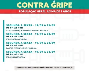 A Secretaria Municipal de Saúde continua oferecendo o imunizante contra a gripe em Nova Friburgo para toda a população. Para todas as idades, a partir dos seis meses de vida, o imunizante estará disponível de segunda a sexta-feira.
