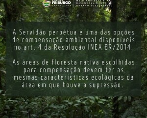 Cerca de 40 mil metros quadrados de florestas nativas do bioma Mata Atlântica estão garantido para preservação perpétua dentro do município de Nova Friburgo. A destinação de área para conservação é uma das opções de compensação ambiental disponíveis no art. 4 da Resolução INEA 89/2014. A ação se dá entre munícipes que possuem compromissos ambientais e escolhem a forma de destinar área para conservação, como quitação dos compromissos ambientais, podendo firmar acordo com os proprietários de áreas de floresta nativa com as mesmas características ecológicas da área na qual houve a supressão.