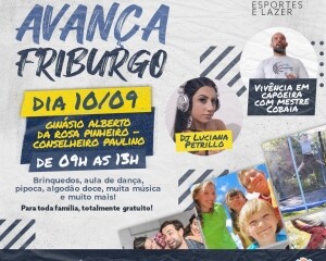 Neste sábado, dia 10, a partir das 9h, será realizada mais uma edição do “Avança Friburgo”, projeto cuja iniciativa é da Prefeitura de Nova Friburgo, através da Secretaria Municipal de Esportes e Lazer, e que conta com o apoio da iniciativa privada. Desta vez, o evento será em Conselheiro Paulino, no Ginásio Alberto da Rosa Pinheiro, ao lado do campo do Pastão.