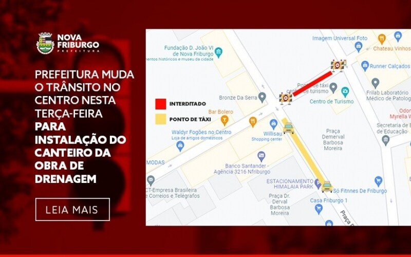 A Prefeitura de Nova Friburgo, por meio da Secretaria Municipal de Ordem e Mobilidade Urbana (Smomu), promove alterações no trânsito do centro da cidade, entre as praças Getúlio Vargas e Dermeval Barbosa Moreira, a partir desta terça-feira, 30 de agosto, para instalação do canteiro da obra de drenagem da Rua Farinha Filho e adjacências, sob responsabilidade do governo do estado.