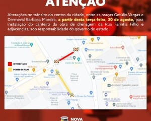O secretário da Smomu lembra ainda que os motoristas que seguem pelo lado par da Praça Getúlio Vargas (Posto Caçulinha e Shopping Castelinho) e quiserem se deslocar para o lado ímpar (Fundação D. João VI e antigo fórum) deverão passar pelo início da Avenida Alberto Braune e contornar pela Rua Augusto Cardoso. Numa segunda etapa da obra essa rua também será interditada, e na ocasião, nova determinação da Smomu será divulgada.