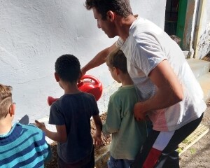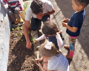 Com conversa informal sobre alimentação saudável e a importância da água, os estudantes regaram a terra, fizeram as covas e plantaram as sementes. Inclusive contoram com uma parceria de sucesso: o pai de um dos alunos, o Leonardo, gentilmente preparou a terra para o plantio e auxiliou durante toda a execução do projeto.