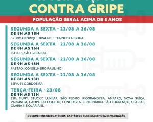 As crianças de 6 meses até 4 anos, 11 meses e 29 dias devem receber a dose nas salas de vacina das unidades básicas de saúde. A outra parte da população, com mais de 5 anos, poderá receber a vacina de segunda a sexta-feira, nos postos do município.