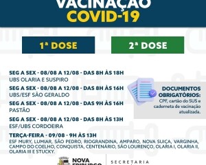A Secretaria Municipal de Saúde da Prefeitura de Nova Friburgo continua oferecendo a vacinação contra a covid-19 durante toda a semana, entre os dias 8 e 12 de agosto, para a população da cidade.